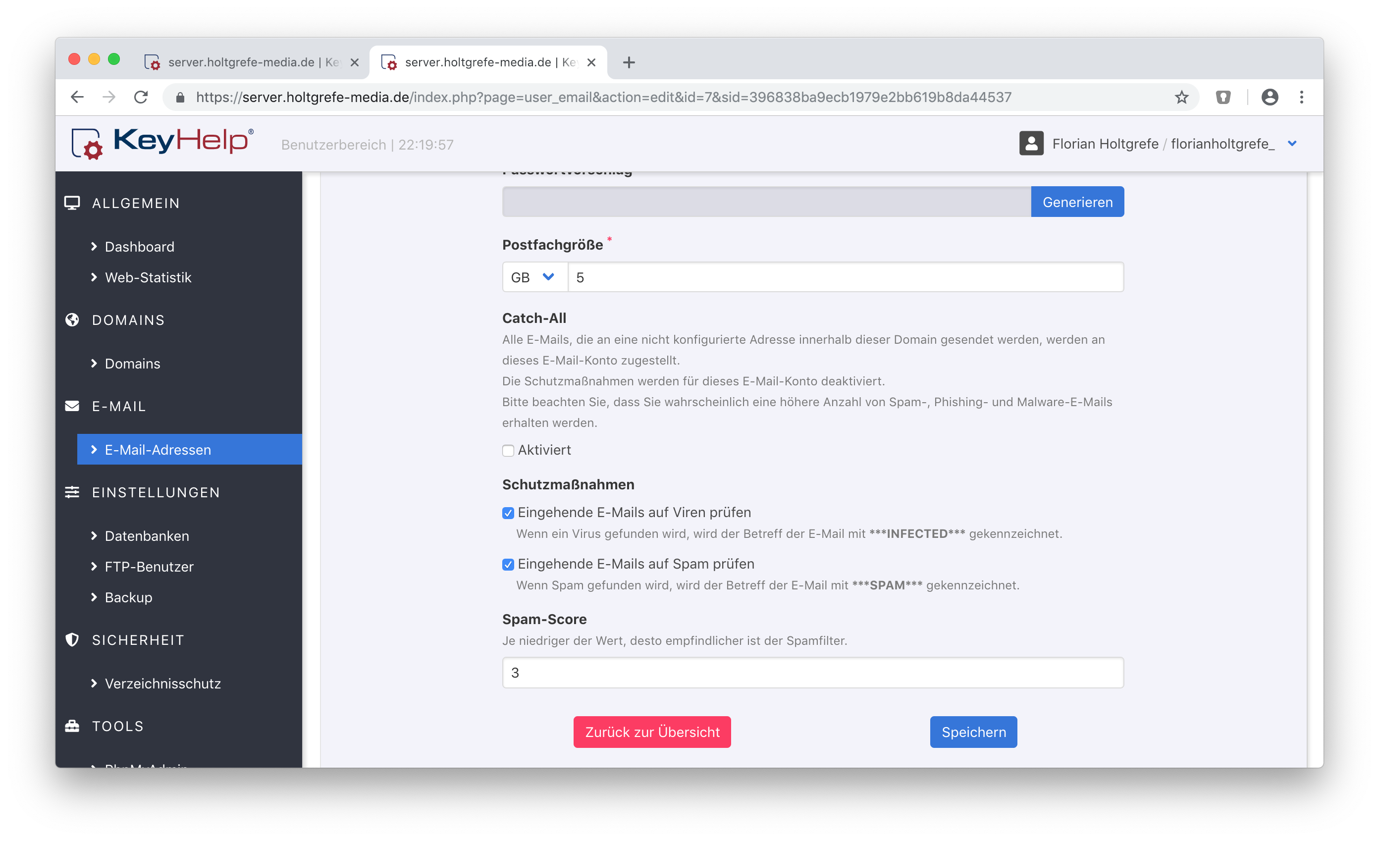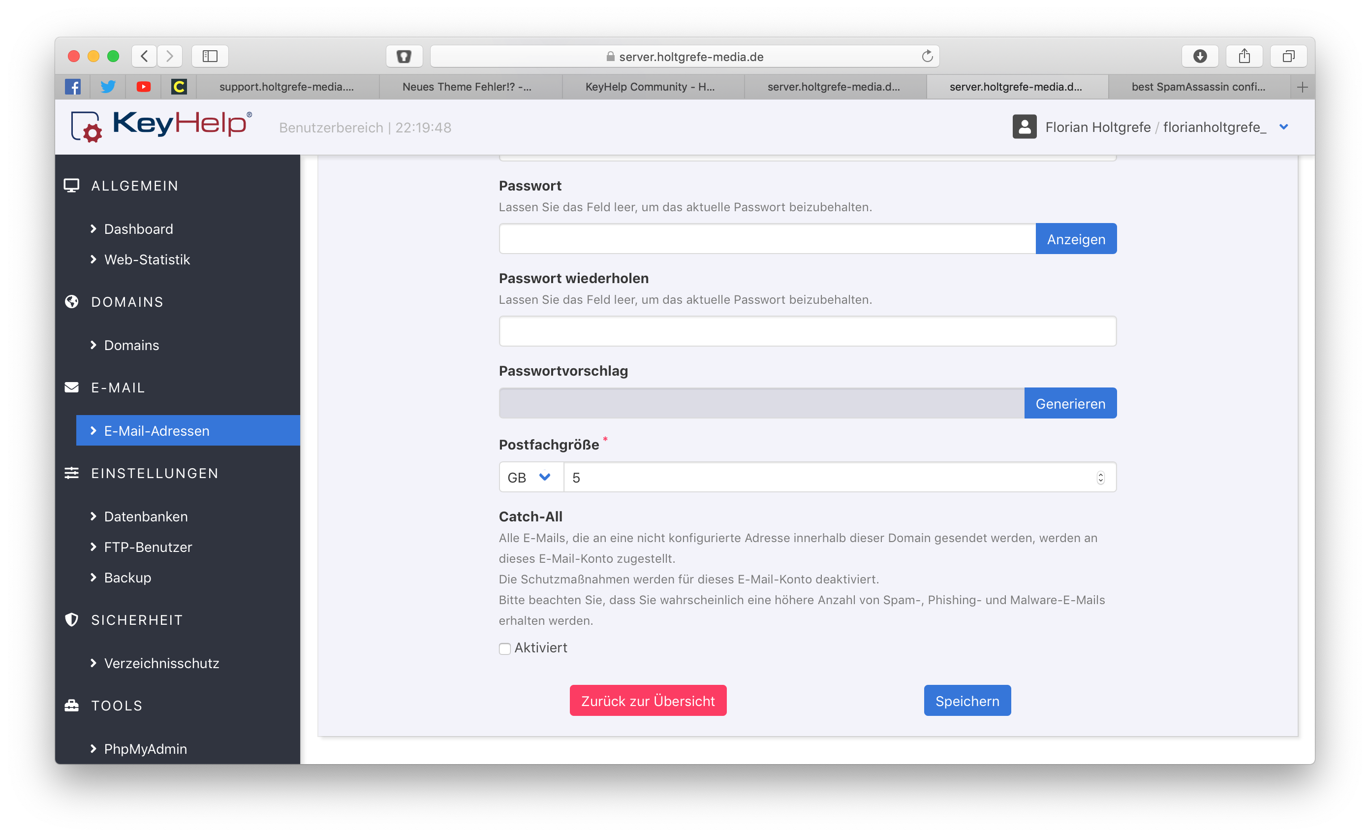 bevor ich mit den Problemen anfange, möchte ich auch erstmal loben und sagen das ich das neue Design echt gelungen und gut finde. Allerdings finde ich in der Benutzeransicht die Einstellungen für die Mail Schutzmaßnahmen, insbesondere den SPAM Score, nicht mehr. Wurde diese Option aus der GUI entfernt, oder bin ich zu blöd diese zu finden.