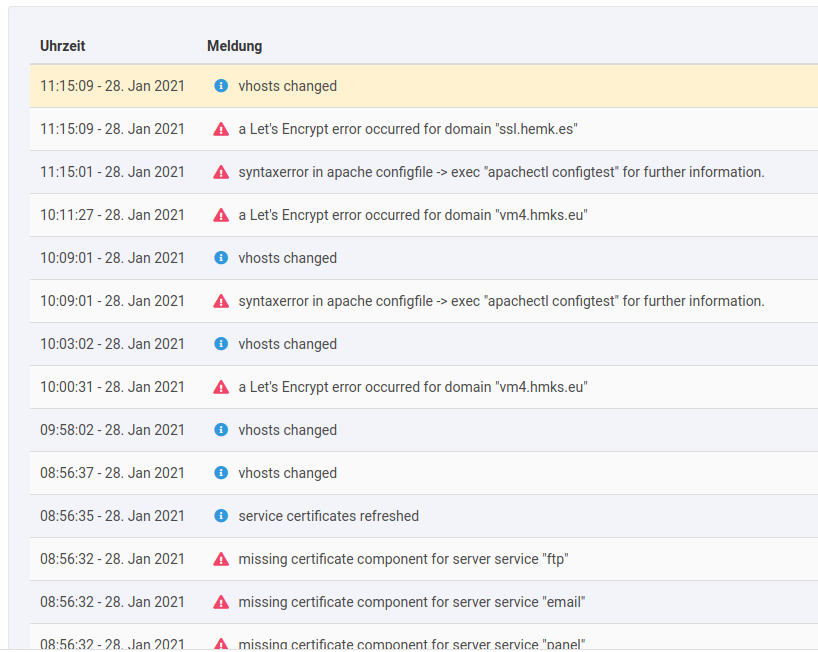 Gerade eben habe ich versucht ein neues SSL Zertifikat für eine Subdomain anzulegen. Das hat auch nicht mehr funktioniert und nun sind alle Domains mit einem roten Zeichen versehen (Siehe Screenshot 1)