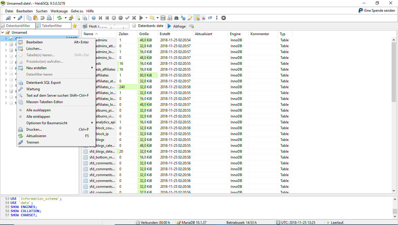 Über phpmyadmin gehen fast alle nur ein paar wichtige irgendwie nicht. DIe gleiche eine hatte beim Import auch schonmal Probleme als es noch ging meine ich, das eine Tabelle angeblich sowas: DROP TABLE IF EXISTS Table structure for table `backend_layout`