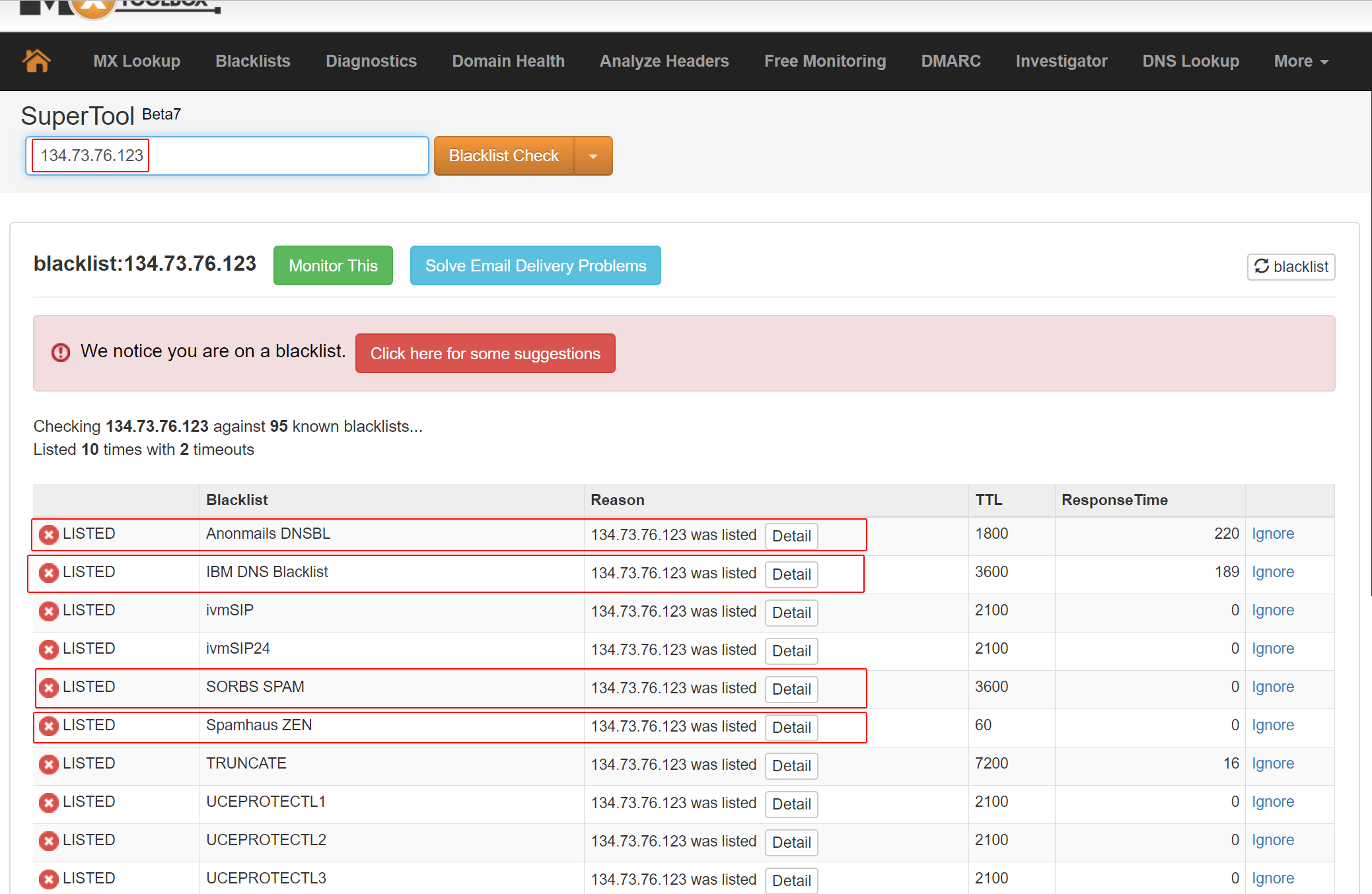Offensichtlich haben lediglich ix.dnsbl.manitu.net und b.barracudacentral.org gefiltert :|