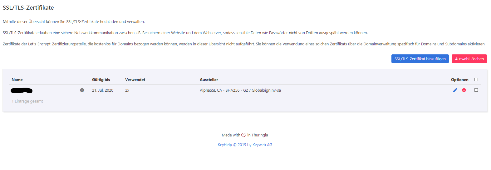 Es kam keine Fehlermeldung, das Zertifikat ist sichtbar, und ich konnte es auch ohne Fehlermeldung bei Domain und Subdomain verwenden.