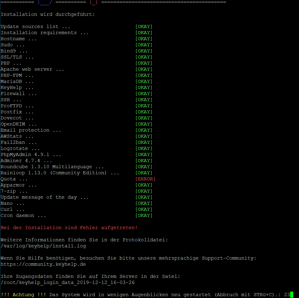 Auf den Quota Error brauchen wir nicht eingehen, dieser Error war bei dem anderen V-Server auch schon… Mich Interessiert nur, warum ich nach der Erfolgreichen Installation keinen Seitenaufbau zu KeyHelp bekomme.