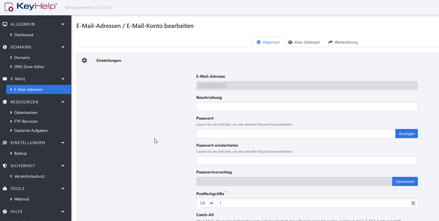 Du meinst die Postfach Größe ? (Benutzer einloggen >> EMail-Adressen >> betroffenes Konto bearbeiten (Stift) >> Postfachgröße)turbopixel wrote: ↑Fri 5. Jun 2020, 20:20 Moin,