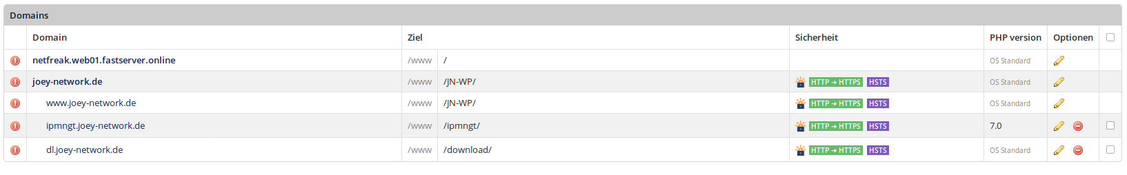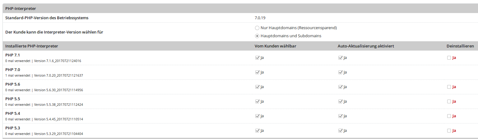 ich bin von einer Debian Jessie auf eine frische Debian Stretch Installation mit Keyhelp Panel umgestiegen. Nun habe ich festgestellt, dass sich PHP Versionen nicht mehr ändern lassen und nun die halben vHost configs kaputt sind. Als Systemstandard PHP-Version war 7.0.19 installiert. Nach der Installation von PHP Version 5.6.30 über das Panel wurde der Systemstandard überschrieben. Nun lässt läuft der Webserver mit PHP 5.6.30, dies lässt sich leider auch manuell nicht über das Panel ändern.