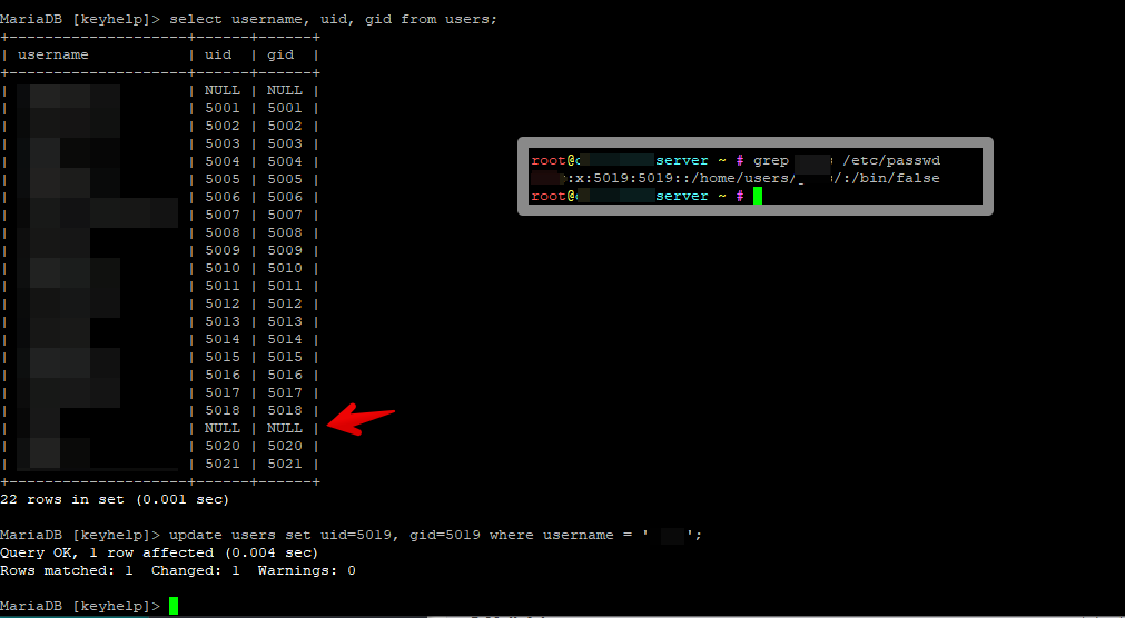 Wenn dein Benutzer nun also vollständig eingerichtet ist und er in der /etc/passwd einen Eintrag hat, dann kannst du die dort aufgeführte UID und GID in die entsprechende Spalte der Datenbank-Tabelle in die Zeile des betroffenen User kopieren.