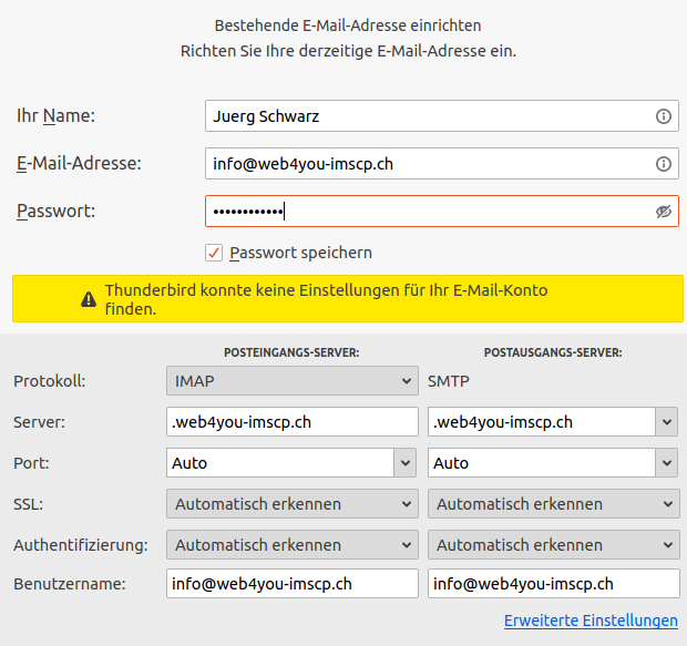 Habe nochmal eine komplette Domain eingerichtet. Email im Thunderbird (nach händischer Konfiguration) läuft. Dann die Email noch mal gelöscht (im TB) und mir beim neu Einrichten ein PrintScreen geschossen. hier: