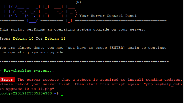 Alles gut, ja ich hab ein Backup gemacht, siehe weiter oben und Bullsey ist drauf, Keyhelp steht auch Bullsey, alles gut. DankeToorms wrote: ↑Mon 13. Jun 2022, 18:54Normalerweise sollte bei allen Keyhelp Updates die aktuellen Konfiguration beibehalten bleiben. Siehe beispielsweise hier Punkt 2) https://www.keyhelp.de/news/upgrade-deb ... debian-11/Samsonetty wrote: ↑Mon 13. Jun 2022, 11:17 Das ist aber dann doch sehr verwirrend, denn man ja mehrere Auswahlen, Y,N,O und noch 2.