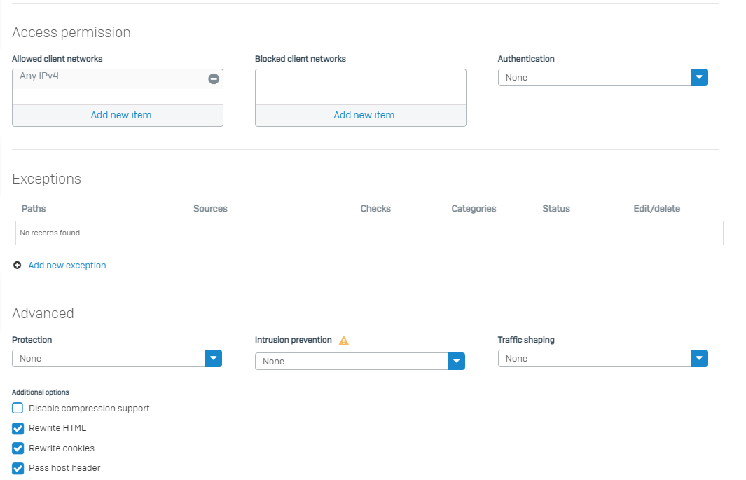 Es werden die Domains weitergeleitet auf einen Host (internen V-Host). Der Host Header wird durchgereicht, und HTML wird auch umgeschrieben. Schutzeinstellungen habe ich keine hinterlegt und alle IPv4. sophos_config.png