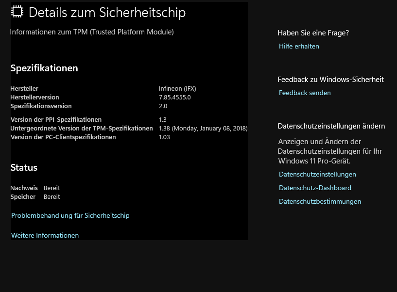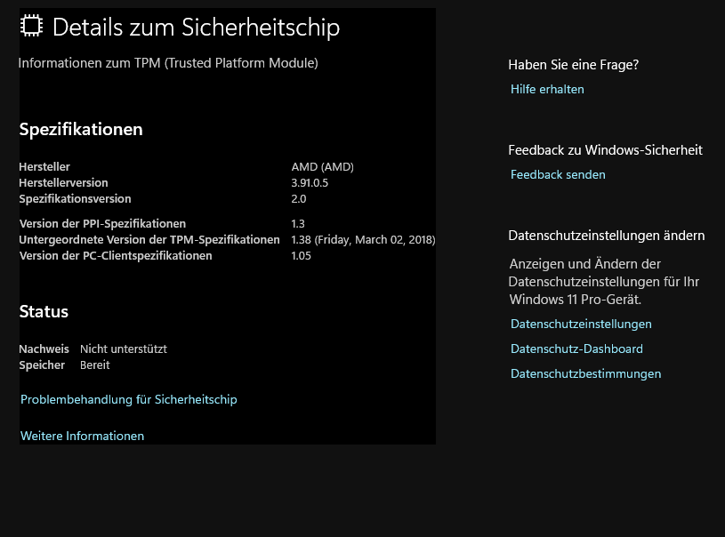 Davon abgesehen,Windows 11 lässt sich ja installieren und TPM lässt sich in Windows 11 auch aktivieren aber, irgendwie nur der TPM-Speicher teil.