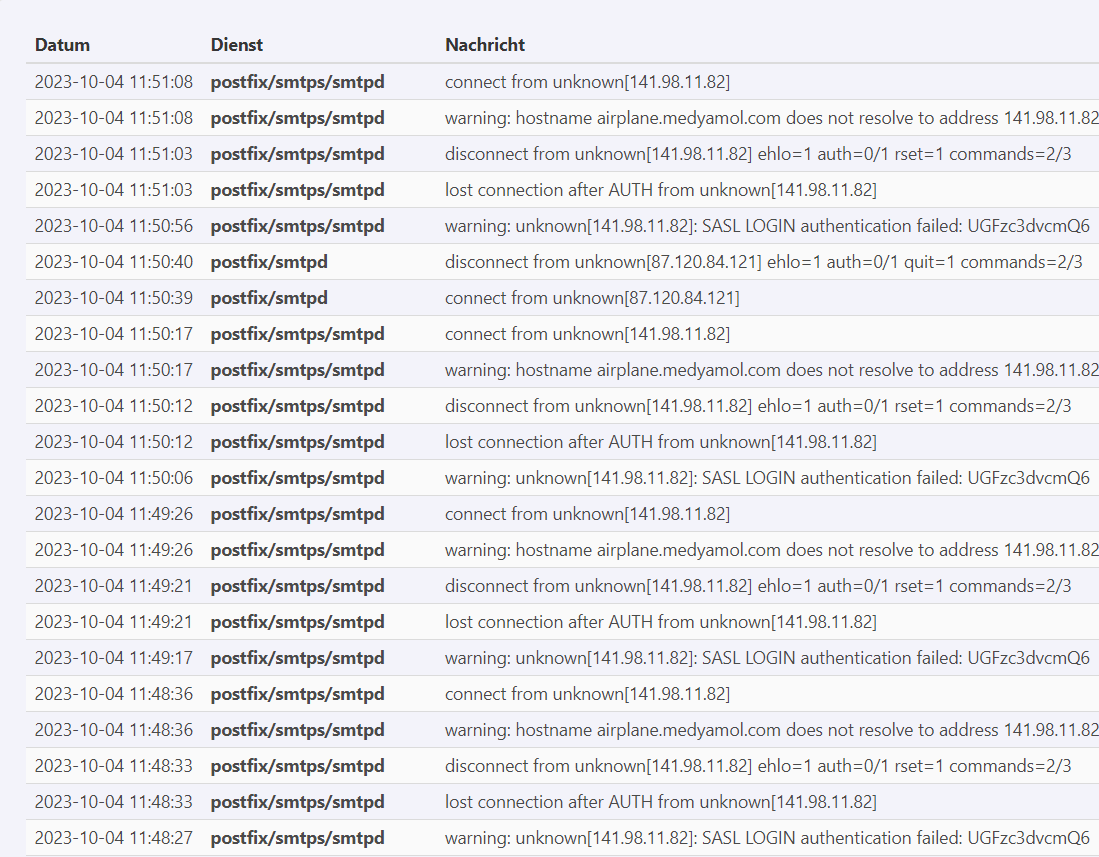 Ist ja offenbar immer die selbe IP 141.98.11.82. Sieht nach Litauen aus. Da scheint jemand zu versuchen, Zugangsdaten für SMTP, also Mailversand, herauszufinden. Seinen PTR hat er gefaked, der Name löst nicht auf seine IP auf, sondern auf 45.79.133.252, irgendein "Internet-Research-Project", was wohl sein Tun verharmlosen soll. Im Erfolgsfall kann er dann Spam über deinen Server versenden, was nicht so lustig wäre angesichts der DNS-Blocklisten. Typischerweise werden da irgendwelche Passwortlisten durchprobiert. Man kann auch herausfinden, welcher User und Passwort angegeben wurden. Das muss man aber erst in Dovecot einstellen, habe ich bei zwei Servern mal gemacht, da sehe ich dann User & Passwort im Log. Sobald aber mal Kunden auf dem Server sind, sollte das natürlich aus Datenschutzgründen deaktiviert werden.