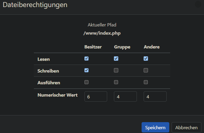 Ich kann in deinem meiner KH-Benutzer im Datei-Manager eine Datei herunterladen, umbenennen, etc. Es sieht mir nach falschen Berechtigungen aus, obwohl diese eigentlich stimmen und ich hier nichts geändert habe: "Die Datei konnte nicht heruntergeladen werden. Gehört Ihnen die Datei?"