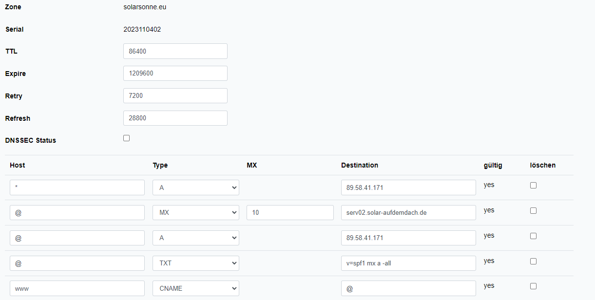 Henning wrote: Sun 5. Nov 2023, 10:50 Dein mx record hat als Hostnamen serv02.solar-aufdemdach.de, dein a record dazu aber mail, warum? Ausserdem konfigurierst du gerade die Domain solarsonne.eu in dem Netcup UI.