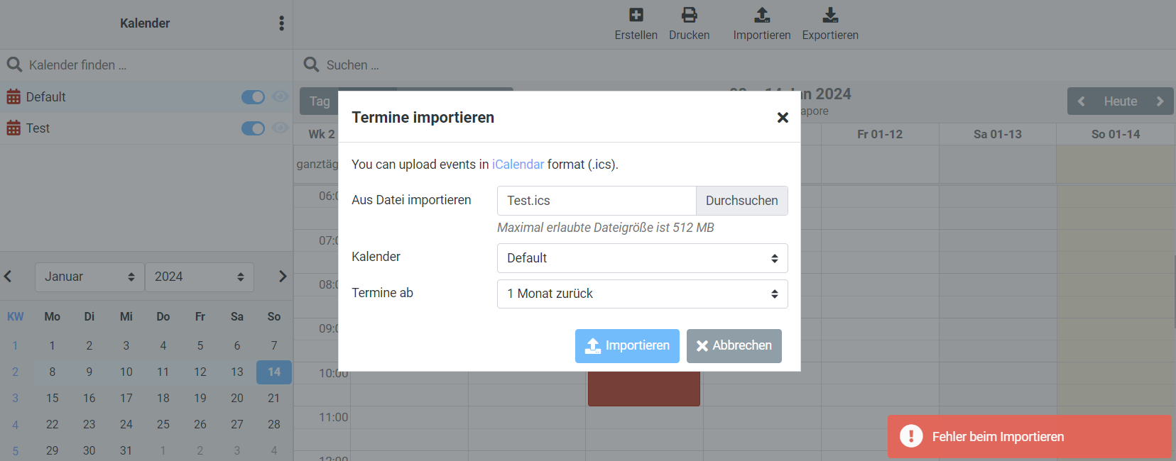 Immer wenn ich im Kalender (der ansonsten super funktioniert. Termine anlegen, anzeigen, entfernen und sowas läuft) versuche zu Importieren gibt es einfach einen Fehler ohne weitere Details. Ich konnte bisher auch keine Logs finden um überhaupt irgendwie Troubleshooten zu können.