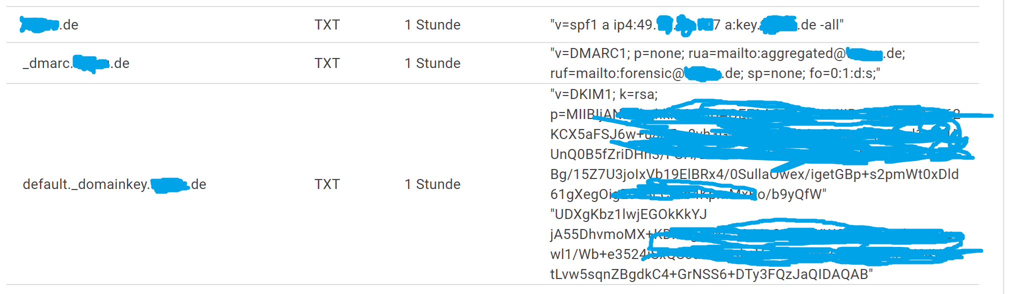 nach https://dmarcly.com/tools/ habe ich erfolgreich die drei Einträge eingerichtet.