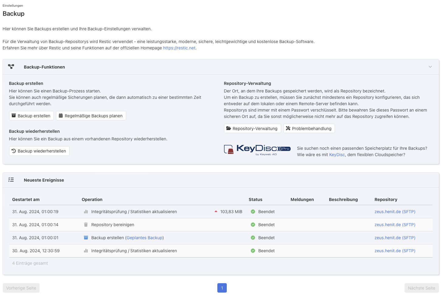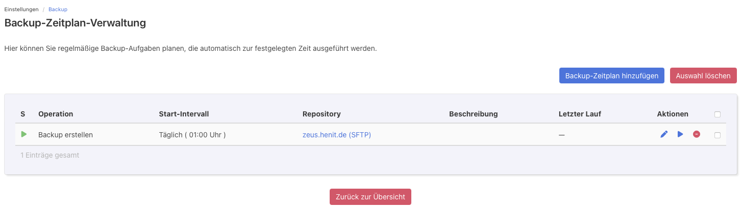 ich habe gestern einen frischen Server aufgesetzt, der erste Backuplauf war für heute morgen 1 Uhr angesetzt. Lief soweit auch durch, nur steht bei „Letzter Lauf“ kein Eintrag. Ist mir auch tatsächlich das erste Mal aufgefallen.
