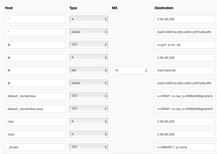 You have henit.de hosted on zeus.henit.de server and you can easily set proper records.Henning wrote: ↑Sun 6. Oct 2024, 20:14 You have to set dkim correctly. Have a look at my screenshot and the settings I made for the specific domain. My panel domain is for example zeus.henit.de. I also have web content and mail traffic for henit.de. So you need two dkim entries.Bildschirmfoto 2024-10-06 um 20.12.20.png