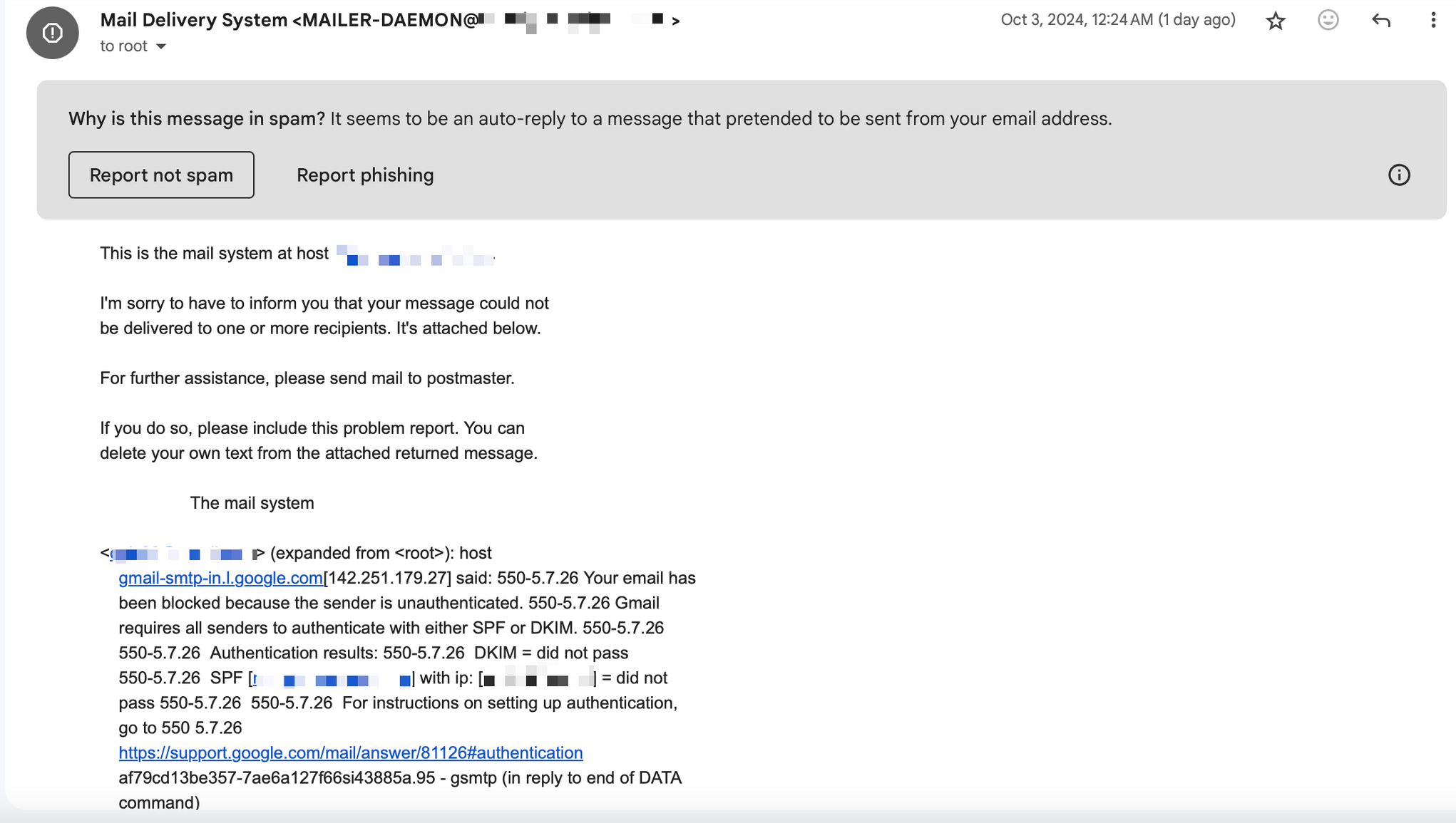 But it's going to the spam folder because there is no SPF and DKIM set.