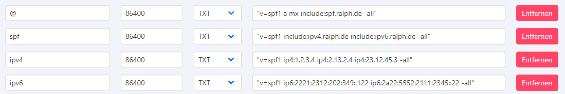 Tobi wrote: Mon 7. Oct 2024, 10:58 Du setzt einmal deine IPV4 Records in einen SPF Record und in den zweiten die IPV6 Records.