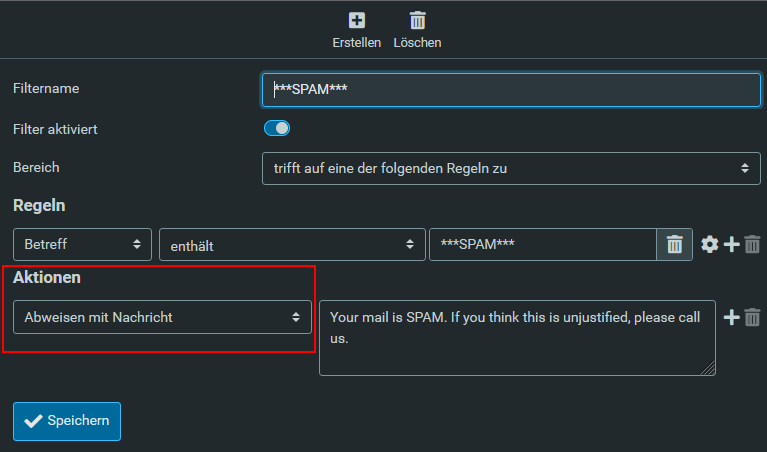 Da meine Whitelist inzwischen auch gut gefüllt ist und der eine oder andere Kontakt aus dem Tagesgeschäft es auch bereits auf diese Whitelist geschafft hat, möchte ich jetzt in Roundcube die Filterregel umstellen. Die Aktion soll jetzt heißen: Abweisen mit Nachricht. Ich hab das so eingerichtet, doch das Abweisen mit Nachricht zeigt keine Wirkung. Die ***SPAM***-markierten E-Mail liegen weiterhin im Ordner Spam.