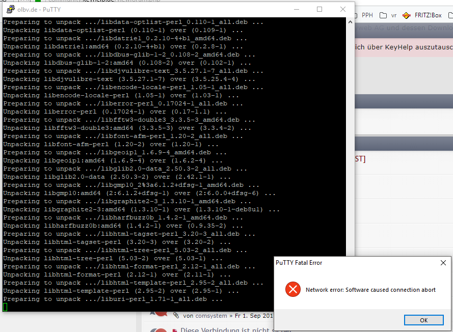 Leider ist nun genau das passiert, was man nicht will und was man immer befürchtet: Während der Installation ist irgendetwas schiefgelaufen bzw. Putty hat sich nach einer Ewigkeit, ohne dass sich etwas getan hat, mit der Meldung "Network Error: Software caused connection abort" verabschiedet.