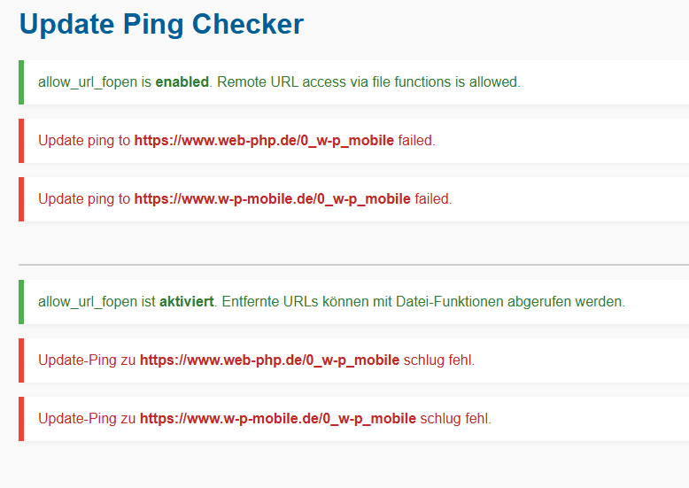 Update Ping Checker allow_url_fopen ist aktiviert. Entfernte URLs können mit Datei-Funktionen abgerufen werden. Update-Ping zu https://www.web-php.de/0_w-p_mobile schlug fehl. Update-Ping zu https://www.w-p-mobile.de/0_w-p_mobile schlug fehl.