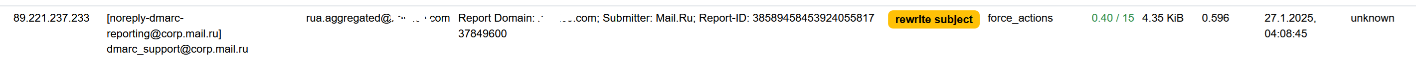 2025-01-27 04:08:46 #1776(normal) <6612A3>; task; rspamd_task_write_log: id: <dmarc-1737947323@corp.mail.ru>, qid: <6612A3EEEA>, ip: 89.221.237.233, from: <noreply-dmarc-reporting@corp.mail.ru>, (default: T (rewrite subject): [0.40/15.00] [MIME_BASE64_TEXT_BOGUS(1.00){},DMARC_POLICY_ALLOW(-0.50){corp.mail.ru;reject;},FORGED_SENDER(0.30){dmarc_support@corp.mail.ru;noreply-dmarc-reporting@corp.mail.ru;},R_DKIM_ALLOW(-0.20){corp.mail.ru:s=mail4;},R_SPF_ALLOW(-0.20){+ip4:89.221.237.128/25;},MIME_BASE64_TEXT(0.10){},MIME_GOOD(-0.10){multipart/mixed;text/plain;},ARC_NA(0.00){},ASN(0.00){asn:47764, ipnet:89.221.236.0/22, country:RU;},CLAM_VIRUS_FAIL(0.00){failed to scan and retransmits exceed;},DKIM_TRACE(0.00){corp.mail.ru:+;},FORCE_ACTION_VIRUS_FAIL(0.00){rewrite subject;},FROM_NEQ_ENVFROM(0.00){dmarc_support@corp.mail.ru;noreply-dmarc-reporting@corp.mail.ru;},FROM_NO_DN(0.00){},HAS_ATTACHMENT(0.00){},MID_RHS_MATCH_FROM(0.00){},MIME_TRACE(0.00){0:+;1:+;2:~;},MISSING_XM_UA(0.00){},RCPT_COUNT_ONE(0.00){1;},RCVD_COUNT_ONE(0.00){1;},RCVD_TLS_LAST(0.00){},RCVD_VIA_SMTP_AUTH(0.00){},TO_DN_NONE(0.00){},TO_MATCH_ENVRCPT_ALL(0.00){}]), len: 4456, time: 596.204ms, dns req: 24, digest: <2d1026e50e49223bd2aec561b2cc7083>, rcpts: <rua.aggregated@abcdef.com>, mime_rcpts: <rua.aggregated@abcdef.com>, forced: rewrite subject "unknown reason"; score=nan (set by force_actions)