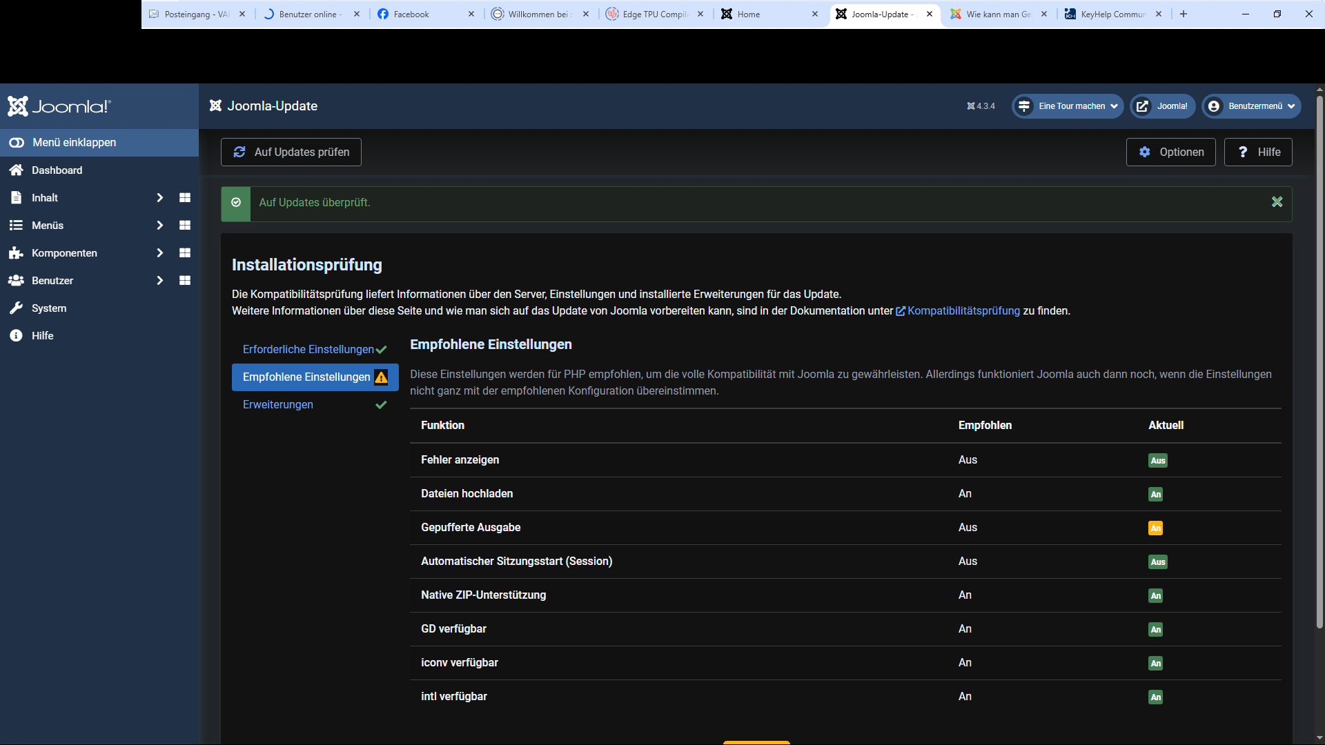 Gibt es denn eine Fehlermeldung?ramfresser wrote: ↑Tue 11. Nov 2025, 21:05 Supi habe den Befehl "output_buffering = off" eingetragen und das Joomla ist Happy, aber das Update läuft trotzdem nicht durch.