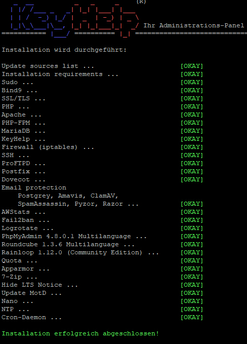 nikko wrote: Wed 30. May 2018, 09:21 Unter var/log/keyhelp/install.log liegt die Datei, welche die Installation mitloggt.