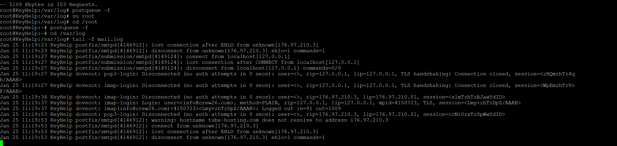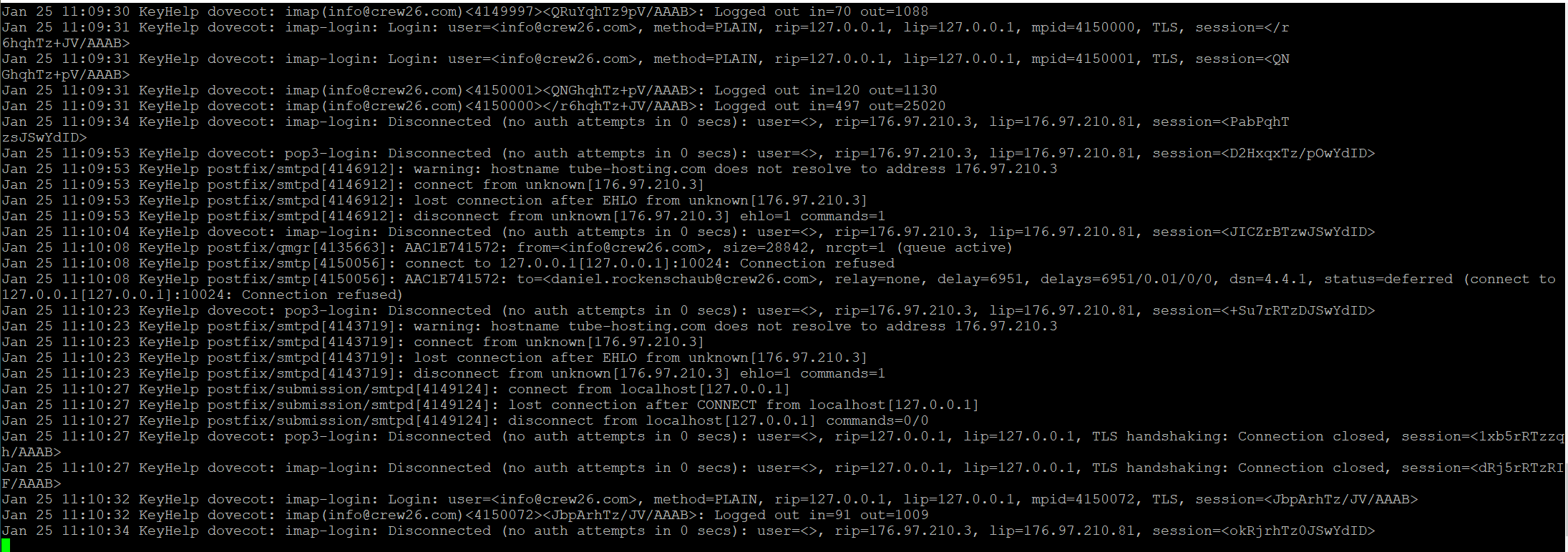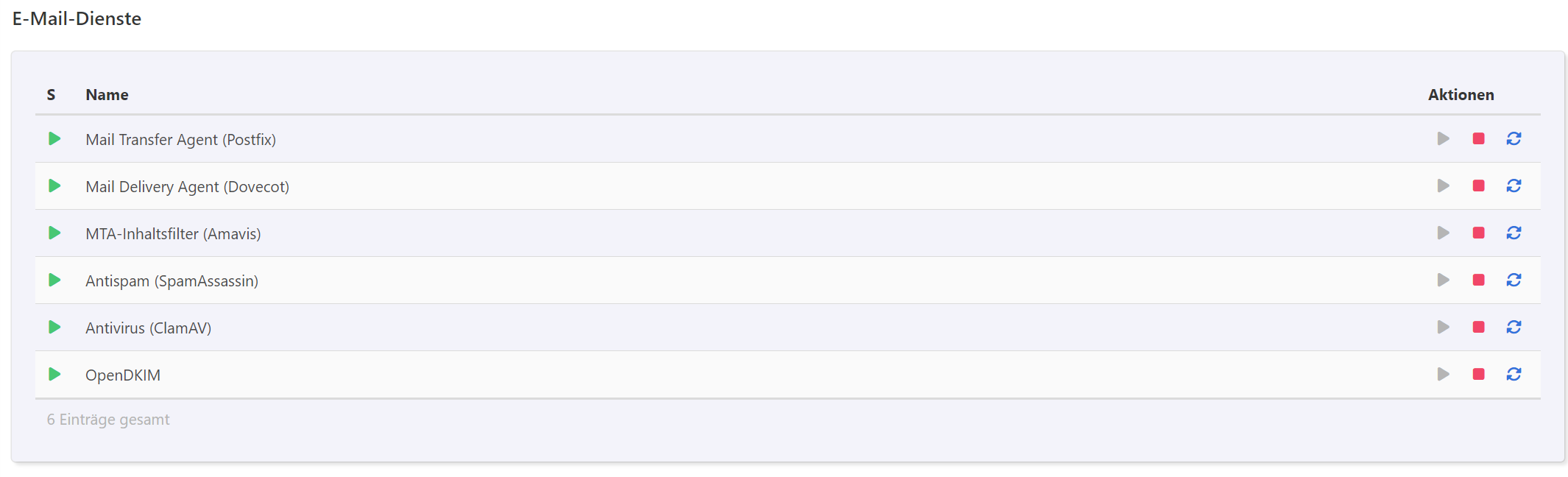 Sieht schon besser aus. Die Mails werden jetzt zugestellt. Es läuft nur der ClamAV nicht, das verhindert aber nicht den Mailverkehr