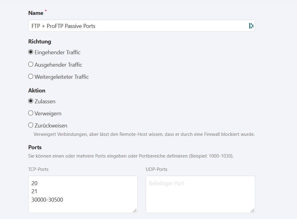 - Dann kannst du noch schauen, was die proftpd Logs anzeigen bei einem Verbindungsversuch, ob dieser überhaupt registriert wird: "/var/log/proftpd/*"