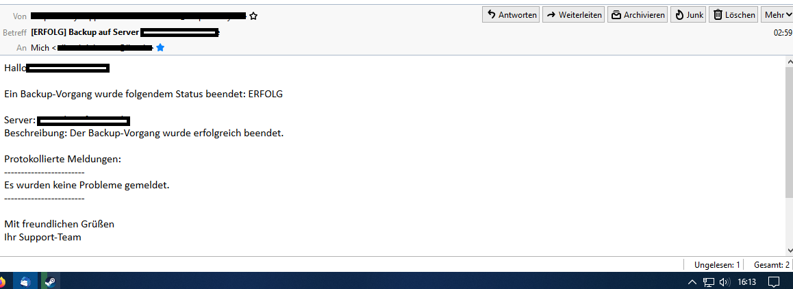 mhagge wrote: Tue 13. Jul 2021, 15:43 Kann es sein, dass die Mail-Benachrichtigung ein Problem hat? Ich habe jetzt schon mehrfach (allerdings manuelle) Backups über das neue Backup-System ausgeführt, augenscheinlich alle erfolgreich. Allerdings kam nie eine Mail mit einer Info, obwohl ich das "auch im Erfolgsfall benachrichtigen" angekreutzt hatte