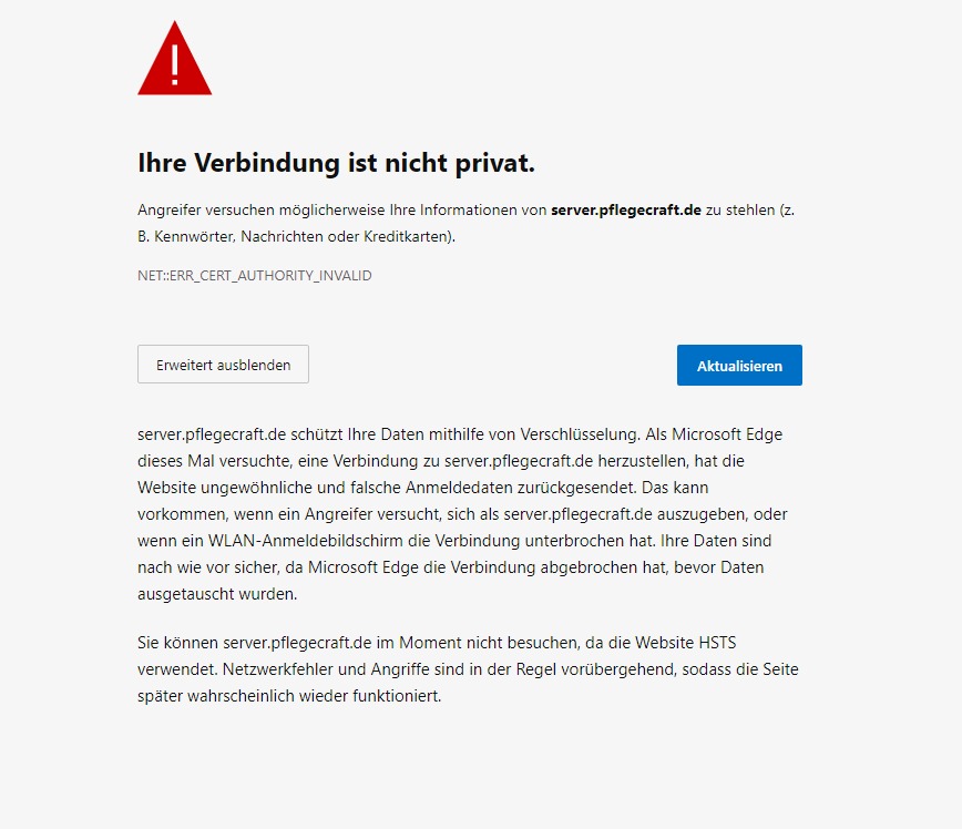 Chrome / Edge und Co (In meinen Augen Browserschrott) kotzen gern sofort rum wenn was mit dem Cert nicht stimmt.Pflegecraft wrote: ↑Mon 2. Aug 2021, 23:24 Fehler meldung ist folgende: