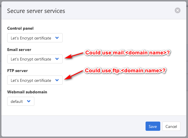 In SECURITY -> SSL/TLS Certificates -> Secure server services, you can use letsencrypt for the control panel server, email server, and ftp server, but the names are panel.<domain name>. May I ask you, like attachments, mail server and ftp server have an exclusive name? In addition, what does webmail subdomain mean?