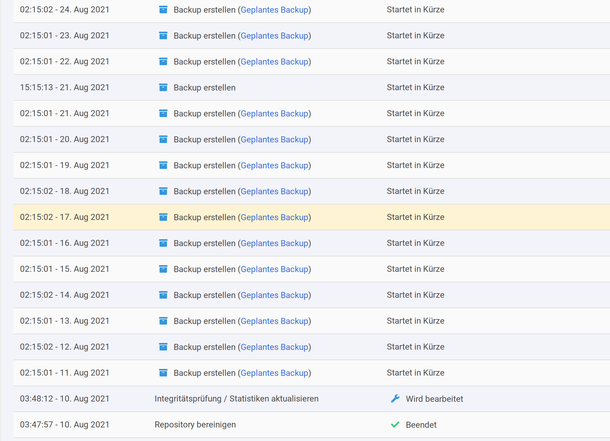 Seite zwei Wochen steht der Status bei Integritätsprüfung / Statistiken aktualisieren auf "Wird bearbeitet" Es wird trotzdem jeden tag der Geplante neue Backupjob gestartet und alle haben den Status "Startet in kürze"