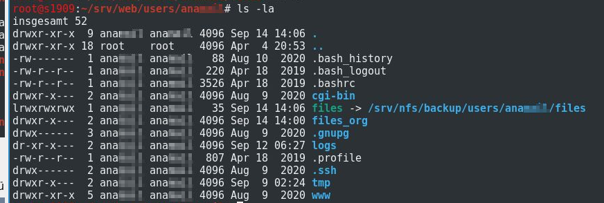 Anbei mail ein paar Screens der Fehlermeldungen im Keyhelp sowie Konsolenansichten der Verzeichnisse. Es geht aktuell um den User, der mit ana beginnt...