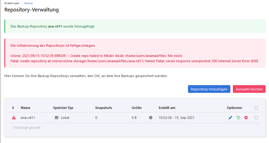 Der 500er Fehler gibt mir zu denken - das ist doch 'n http-Status, und hat mit restic und oder Shell ja nix zu tun - den wirft ja Keyhelp..