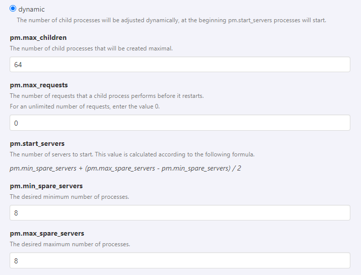 For PHP-FPM, set pm.Max_Children = Max Thread in Apache, that way 1 child process in Apache will go along with 1 child process in PHP-FPM, side by side, accelerating the process. Best use in this scenario is for STATIC but really eating a lot of RAM. If you choose STATIC then set : Max Children = pm_min = pm_max. This config is for Dynamic with enough children to serve in beginning to reserve RAM for anything else but ready for traffic spike.