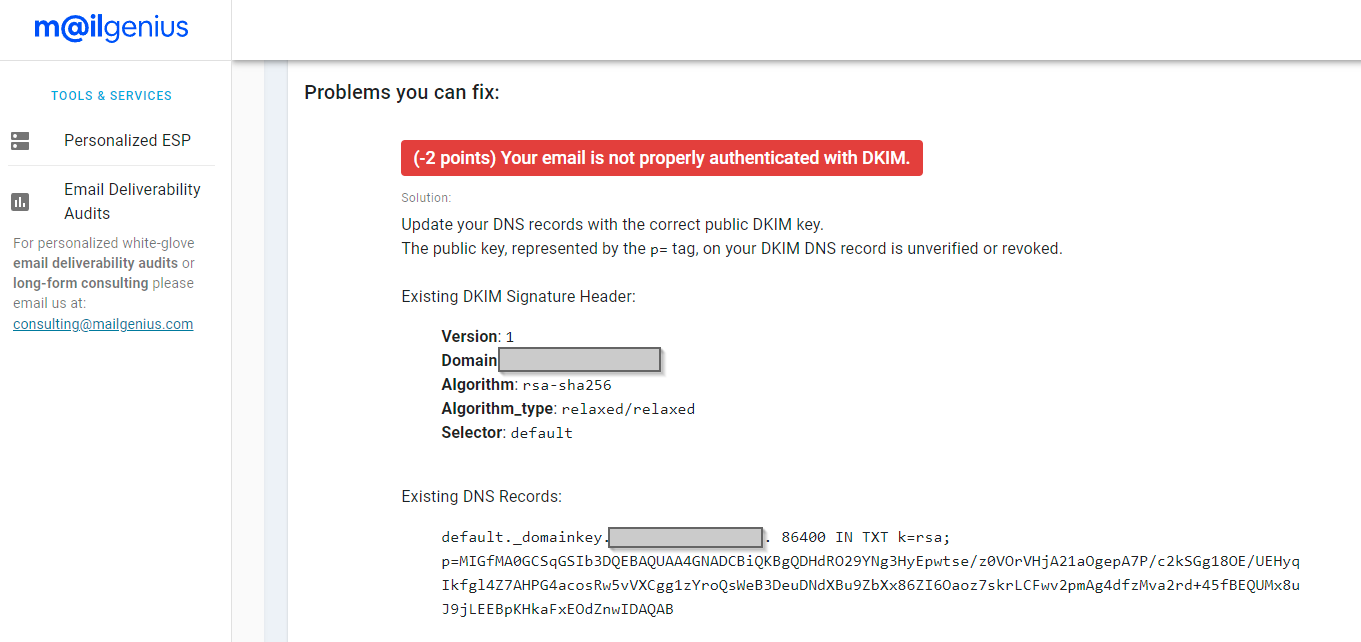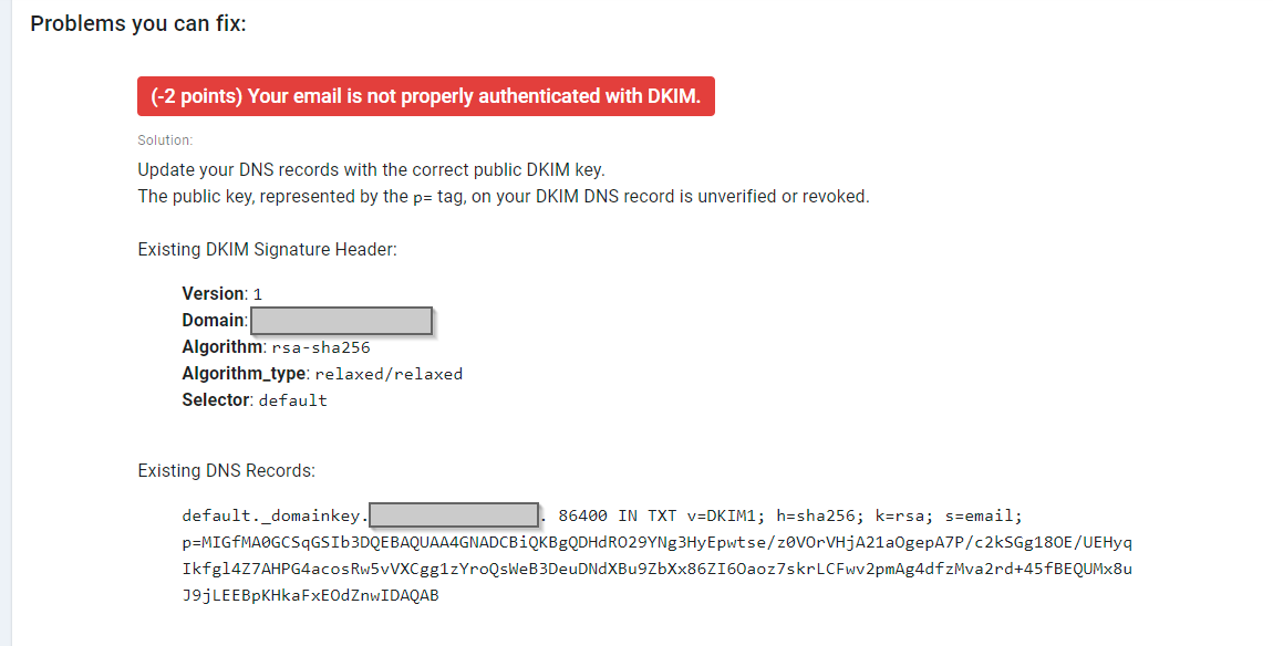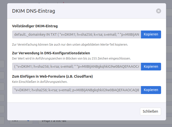 Bei deinem Screenshot fällt mir auf, daß die DKIM Version und der DKIM Selector fehlen. Normalerweise sollte der Eintrag so aussehen:DocMacFoxx wrote: ↑Tue 26. Apr 2022, 08:35 Leider funktioniert DKIM immer noch nicht, hier die Meldung von Mailgenius, da sieht man auch schon den 1024 bit Key.