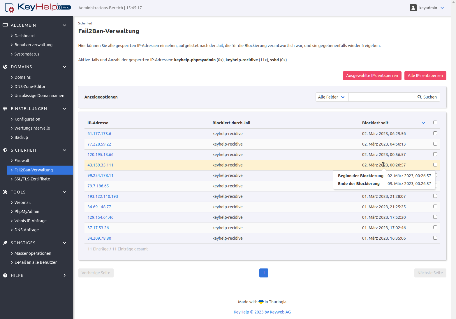 vielleicht gibt es die Möglichkeit in der Fail2Ban Übersicht neben den IP´s die geblockt sind, auch die Dauer anzuzeigen, also wie lange die entsprechende IP noch gesperrt ist?