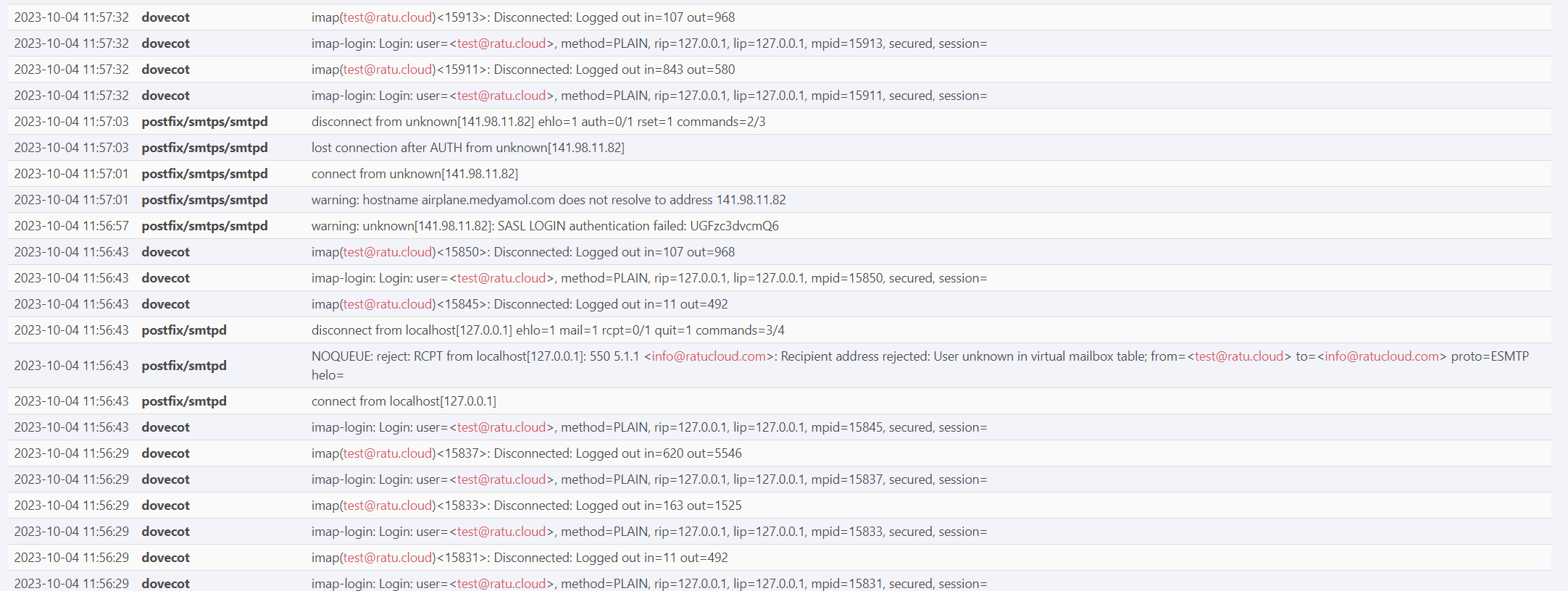Ist ja offenbar immer die selbe IP 141.98.11.82. Sieht nach Litauen aus. Da scheint jemand zu versuchen, Zugangsdaten für SMTP, also Mailversand, herauszufinden. Seinen PTR hat er gefaked, der Name löst nicht auf seine IP auf, sondern auf 45.79.133.252, irgendein "Internet-Research-Project", was wohl sein Tun verharmlosen soll. Im Erfolgsfall kann er dann Spam über deinen Server versenden, was nicht so lustig wäre angesichts der DNS-Blocklisten. Typischerweise werden da irgendwelche Passwortlisten durchprobiert. Man kann auch herausfinden, welcher User und Passwort angegeben wurden. Das muss man aber erst in Dovecot einstellen, habe ich bei zwei Servern mal gemacht, da sehe ich dann User & Passwort im Log. Sobald aber mal Kunden auf dem Server sind, sollte das natürlich aus Datenschutzgründen deaktiviert werden.
