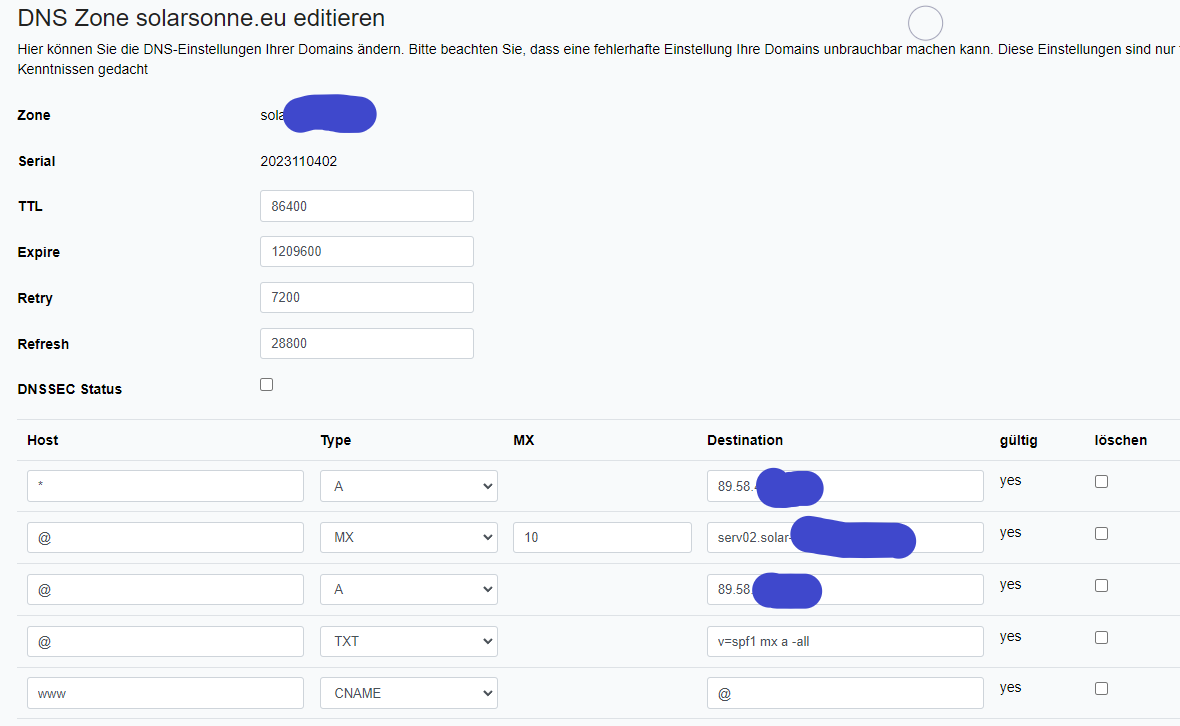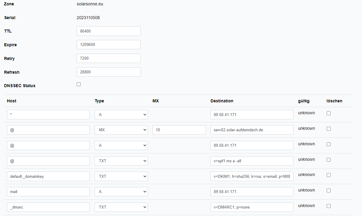 Henning wrote: Sun 5. Nov 2023, 10:50 Dein mx record hat als Hostnamen serv02.solar-aufdemdach.de, dein a record dazu aber mail, warum? Ausserdem konfigurierst du gerade die Domain solarsonne.eu in dem Netcup UI.
