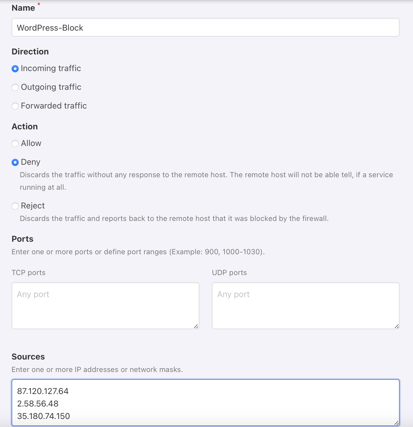 In this example (Port 22), the specified IP addresses will not be able to connect via SSH, but they still can see your websites etc.