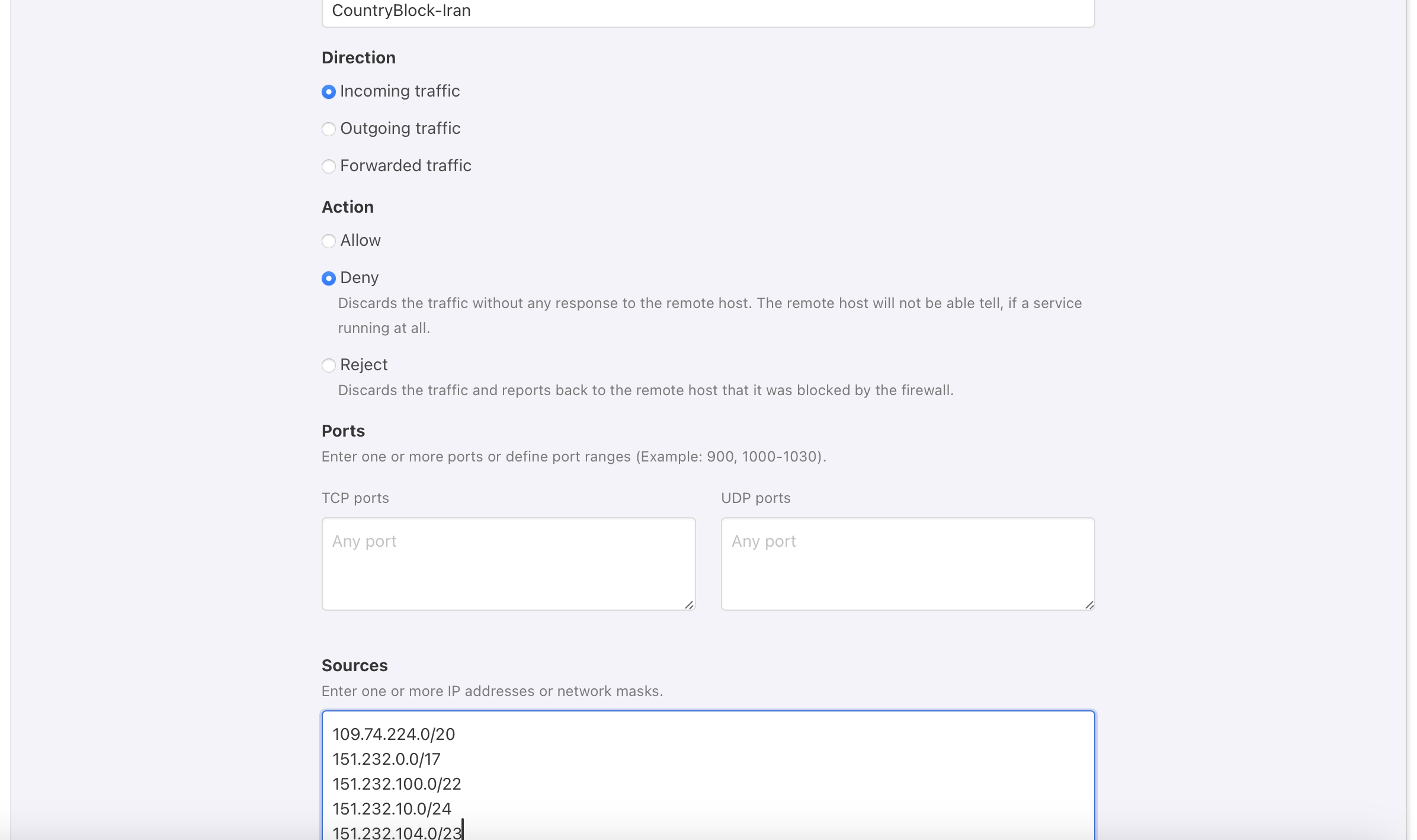 2) If you put in a port - for example 22 (= SSH) - than only the services listening on the specified port(s) will be blocked for the IP addresses.
