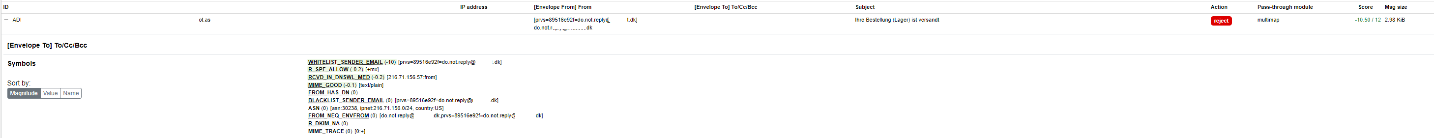 Jetzt stellt sich das Verhalten von rspamd aber scheinbar so dar, dass die Blacklist höher gewertet wird, als die Blacklist. Es wäre super, dass man in den globalen E-Mail Einstellungen die Einstellung vornehmen kann, dass beispielsweise erst die Whitelist behandelt wird und anschließend die Blacklist.