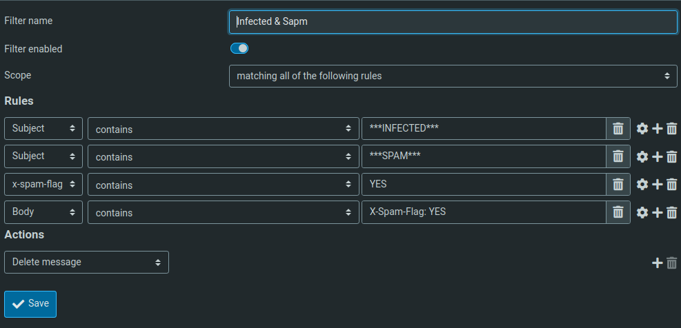 SPAM Mails die bei einem User ankommen werden als ***SPAM*** markiert aber der Filter der ueber Roundcube erstellt ist funktioniert nicht... die Mails werden nicht geloescht sondern zugestellt.