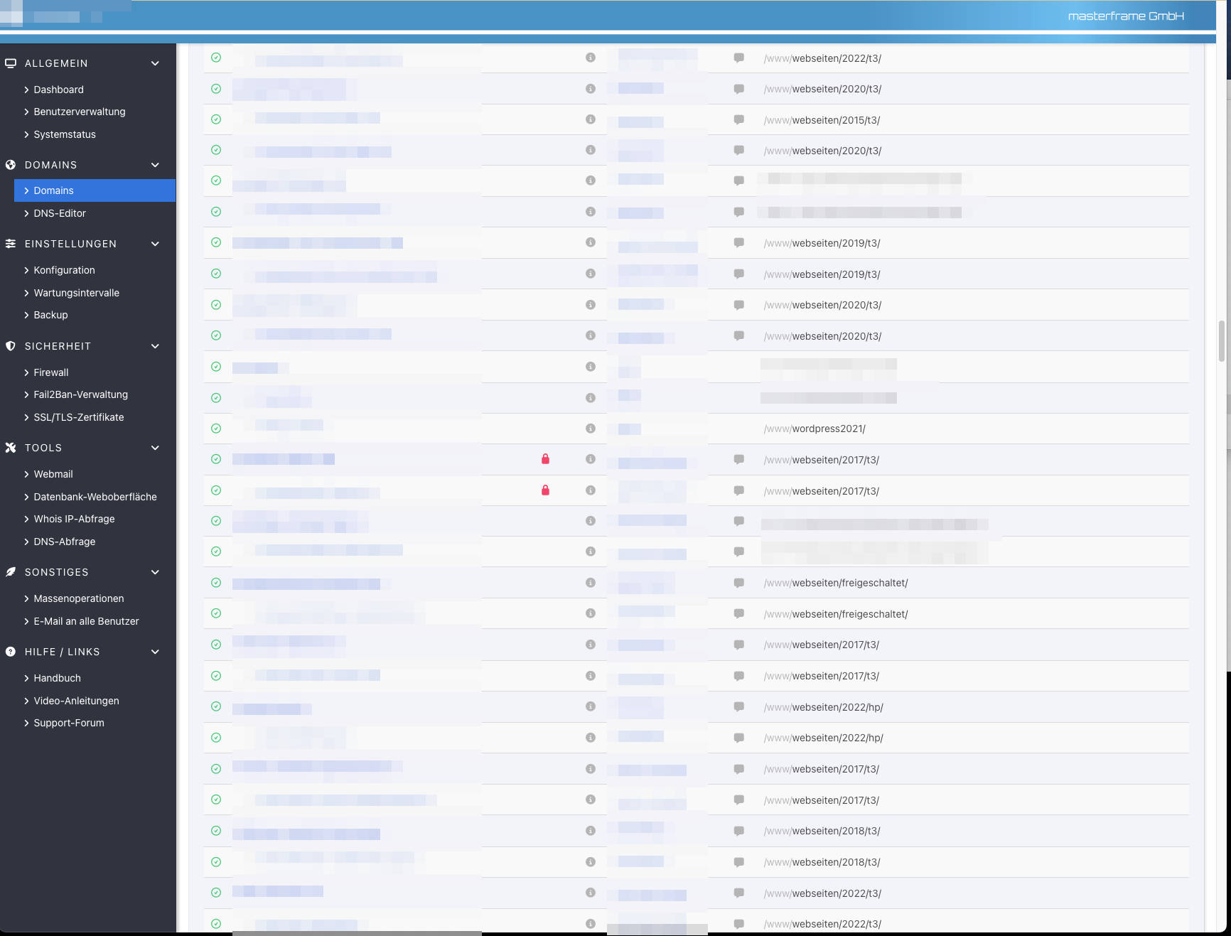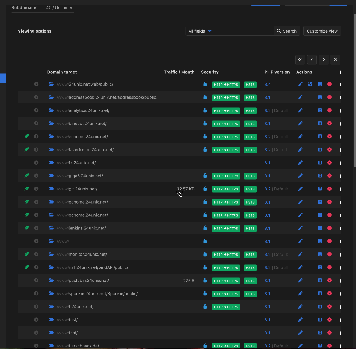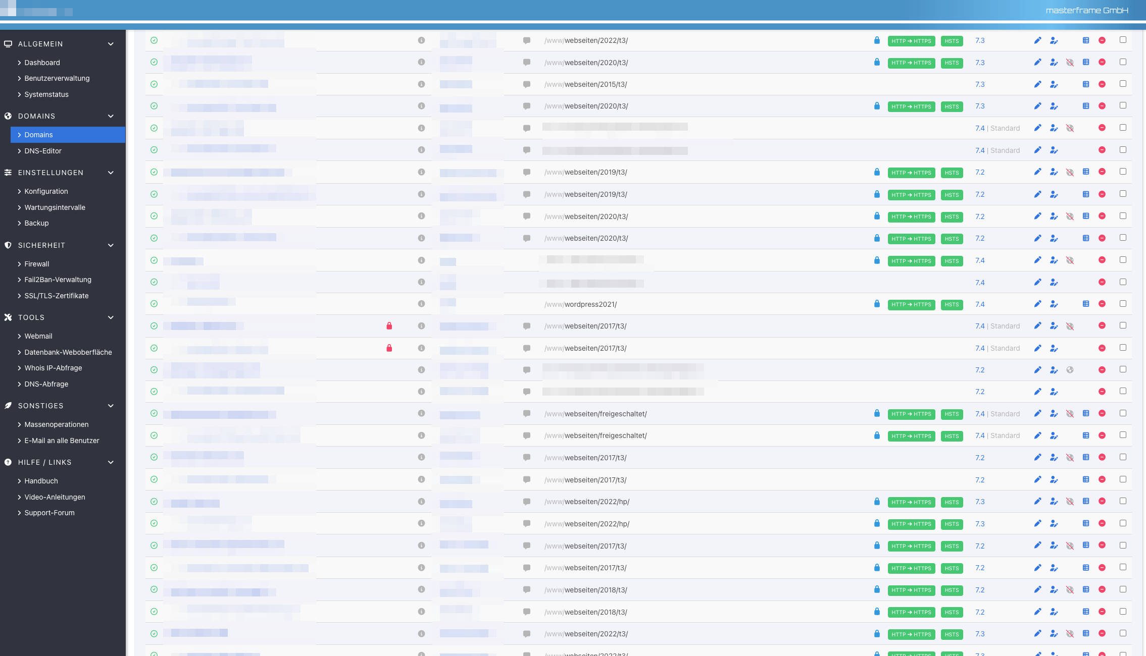 In der Übersicht der Domains ist es auf dem einen Server erst möglich alle Angaben zu sehen wenn der Bildschirm mindestens eine Breite von 2269 Pixeln hat. Exemplarisch habe ich hier mal einen Screenshot mit voller Breite und einmal mit "nur" 1732 Pixeln.