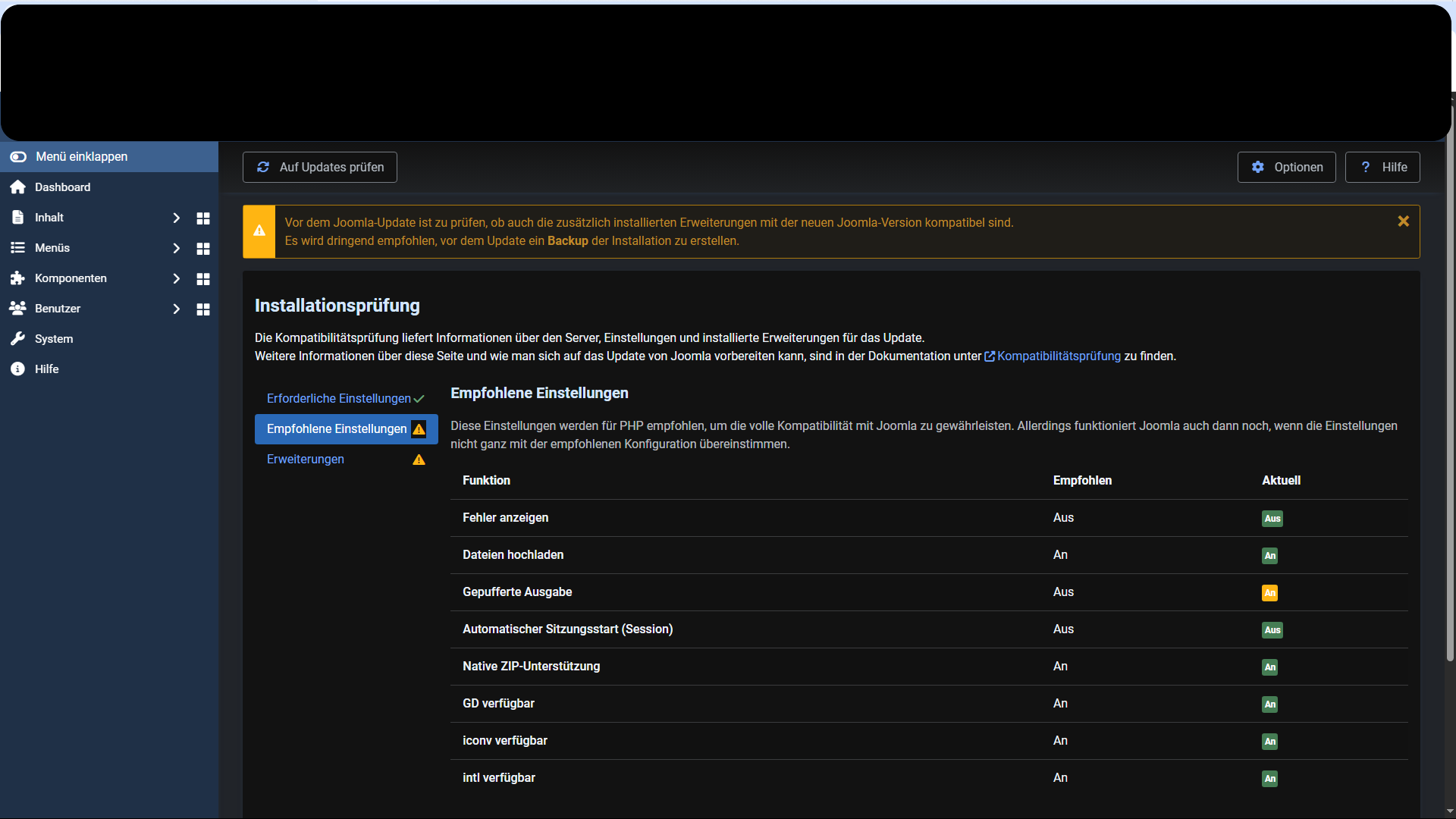 ramfresser wrote: Tue 11. Nov 2025, 21:05 Supi habe den Befehl "output_buffering = off" eingetragen und das Joomla ist Happy, aber das Update läuft trotzdem nicht durch.
