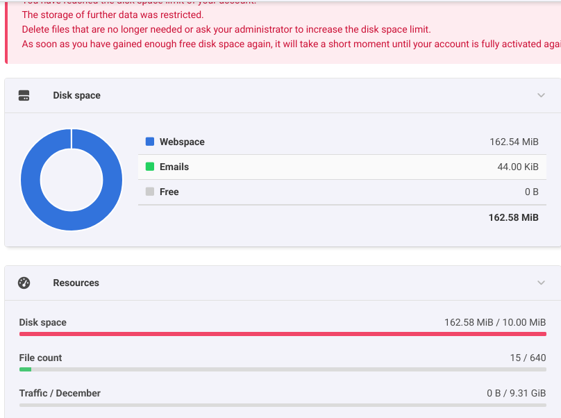 Diskspace : 162.58 MiB / 10.00 MiB - 1,625.82%