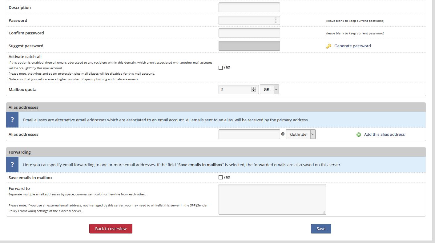Hier wird der Haken aktuell nicht automatisch gesetzt, wenn man von einem Catchall auf ein normales Konto umstellt. Danach sollten die zusätzlichen Einstellungen erscheinen.