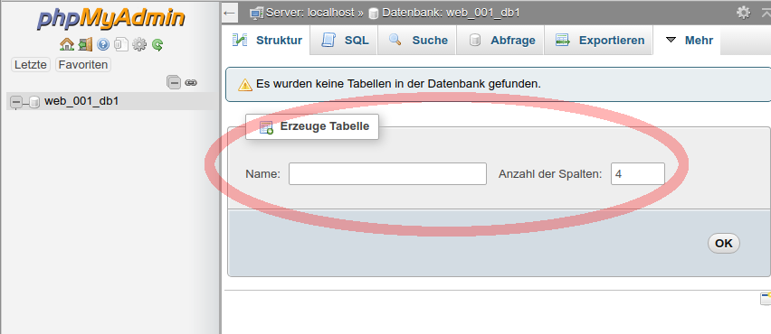 Wenn du eine neue Tabelle erstellen möchtest: Klickst du oben auf den Reiter SQL und schickst das folgende Query ab: